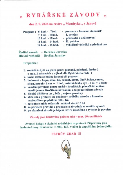 Zájemcům o rybářské závody pořádané našimi sousedními spřátelenými organizacemi doporučuji shlédnout jejich pozvánky na níže uvedených odkazech.